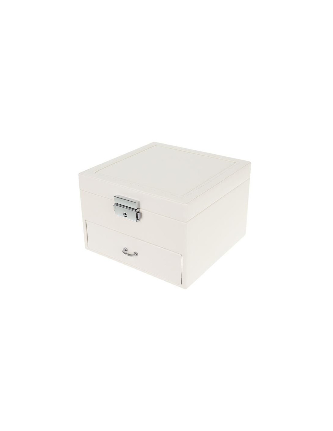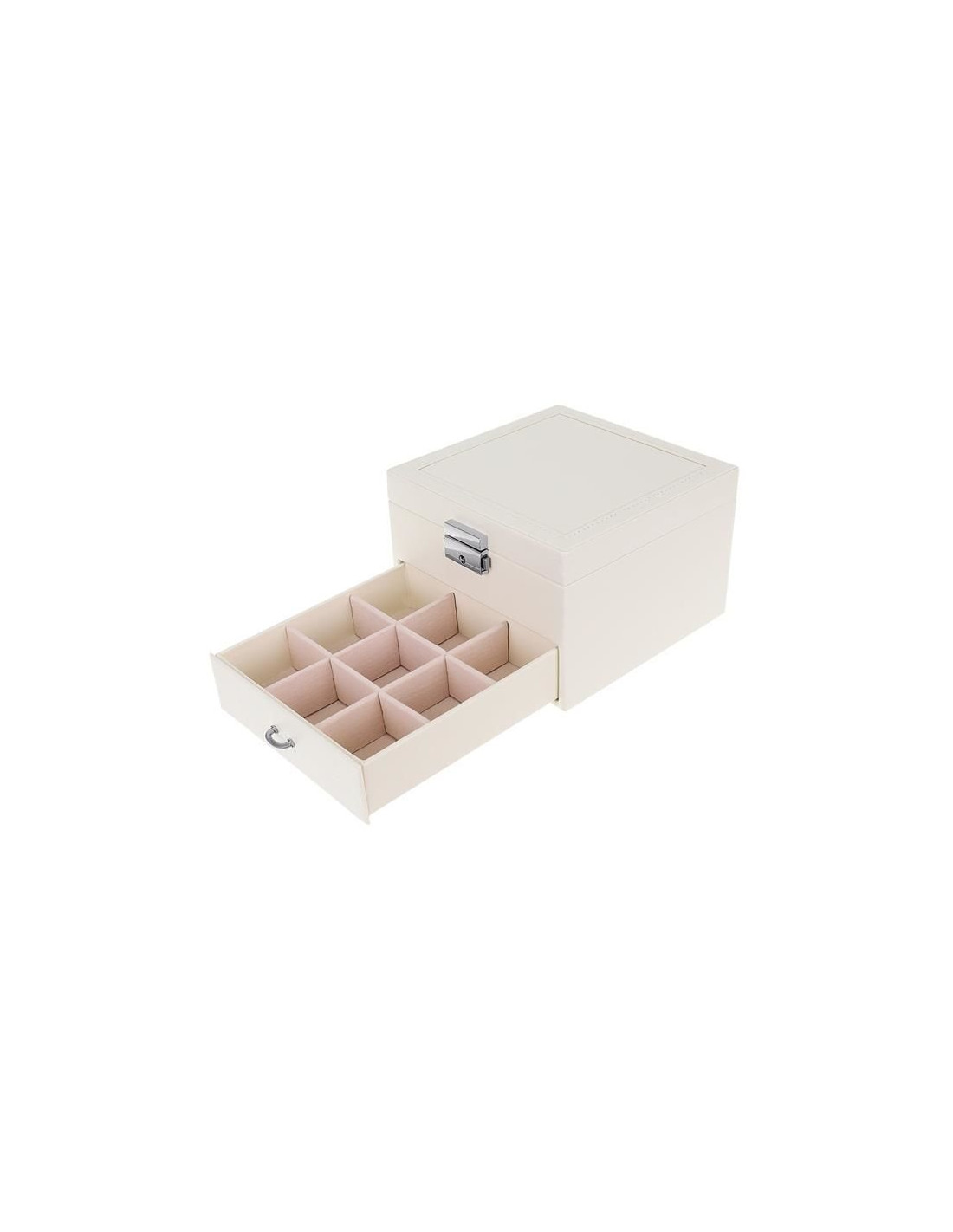 PRÁTICO - A Caixa é composta por dois níveis. A primeira é uma gaveta retrátil com 9 compartimentos pequenos que permitem colocar, por exemplo, brincos pequenos. No segundo nível, há uma longa fileira de compartimentos com rolos para anéis e dois grandes compartimentos nas laterais para o restante das joias, como correntes, pulseiras, pingentes, relógios e muito mais. O organizador é forrado com um material macio para proteger as joias delicadas e valiosas contra arranhões.
